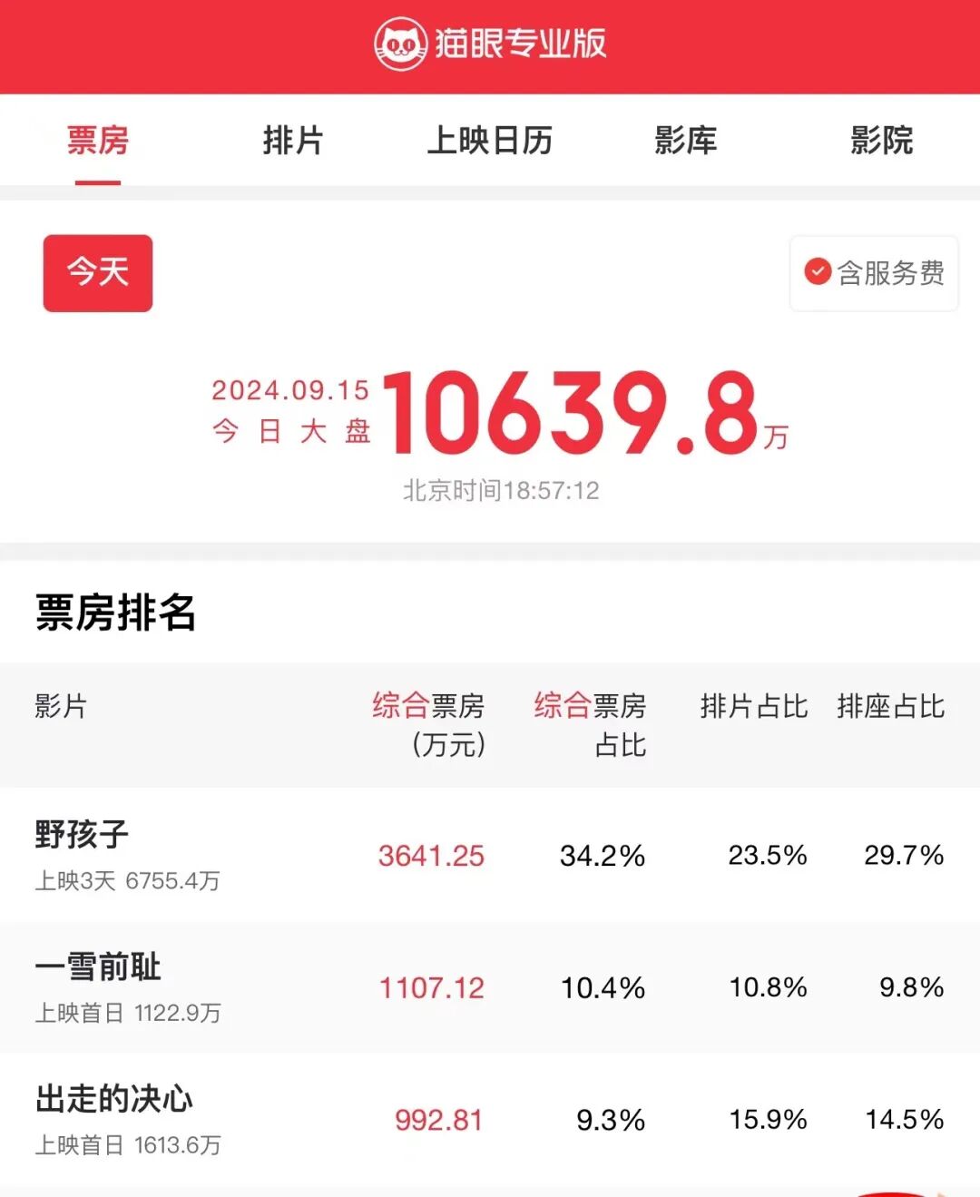 《野孩子》《一雪前耻》《出走的决心》暂列当前中秋档档期内票房前三位。