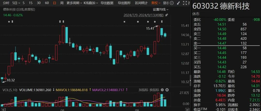 证券时报·e公司记者注意到,德新科技股票曾在9月10日、9月11日连续两个交易日涨停,当时公司发布披露股票交易异常波动公告称,不存在应披露而未披露的重大信息,“公司董事会确认,公司没有任何根据《上海证券交易所股票上市规则》等有关规定应披露而未披露的事项或与该等事项有关的筹划、意向、商谈、协议。”