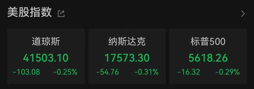 美股三大指数集体收跌。道指跌103.08 点,跌幅为0.25%,报41503.10点;纳指跌54.76点,跌幅为0.31%,报17573.30点;标普500指数跌16.32点,跌幅为0.29%,报5618.26点。