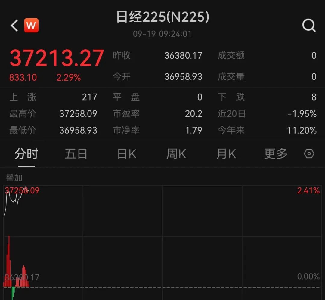 9月19日早盘,日本股市高开。日经225指数高开,截至发稿涨超2%,报37213.27,飙涨833点。