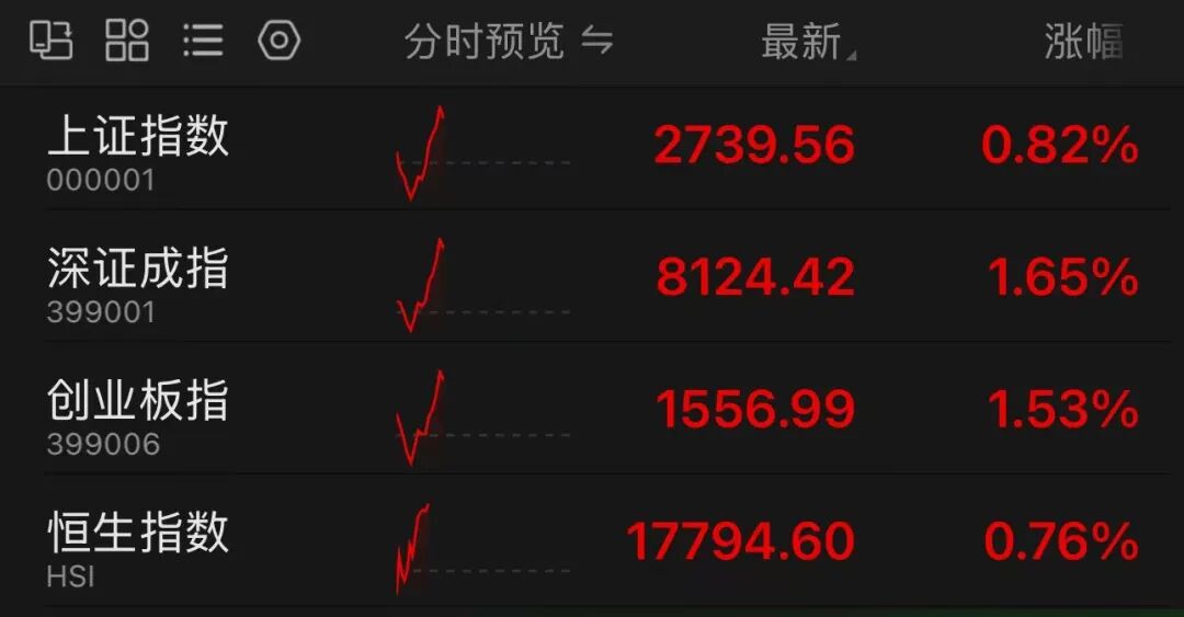 A股三大指数大涨。创业板指涨幅扩大至1.53%,上证指数涨0.82%,深证成指涨1.65%。