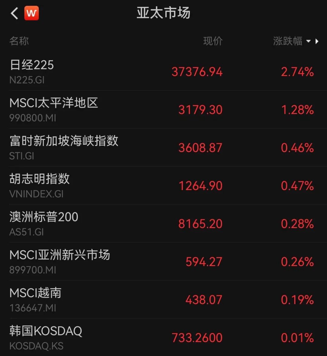 亚太股市集体上涨,日经225指数大涨2.74%。