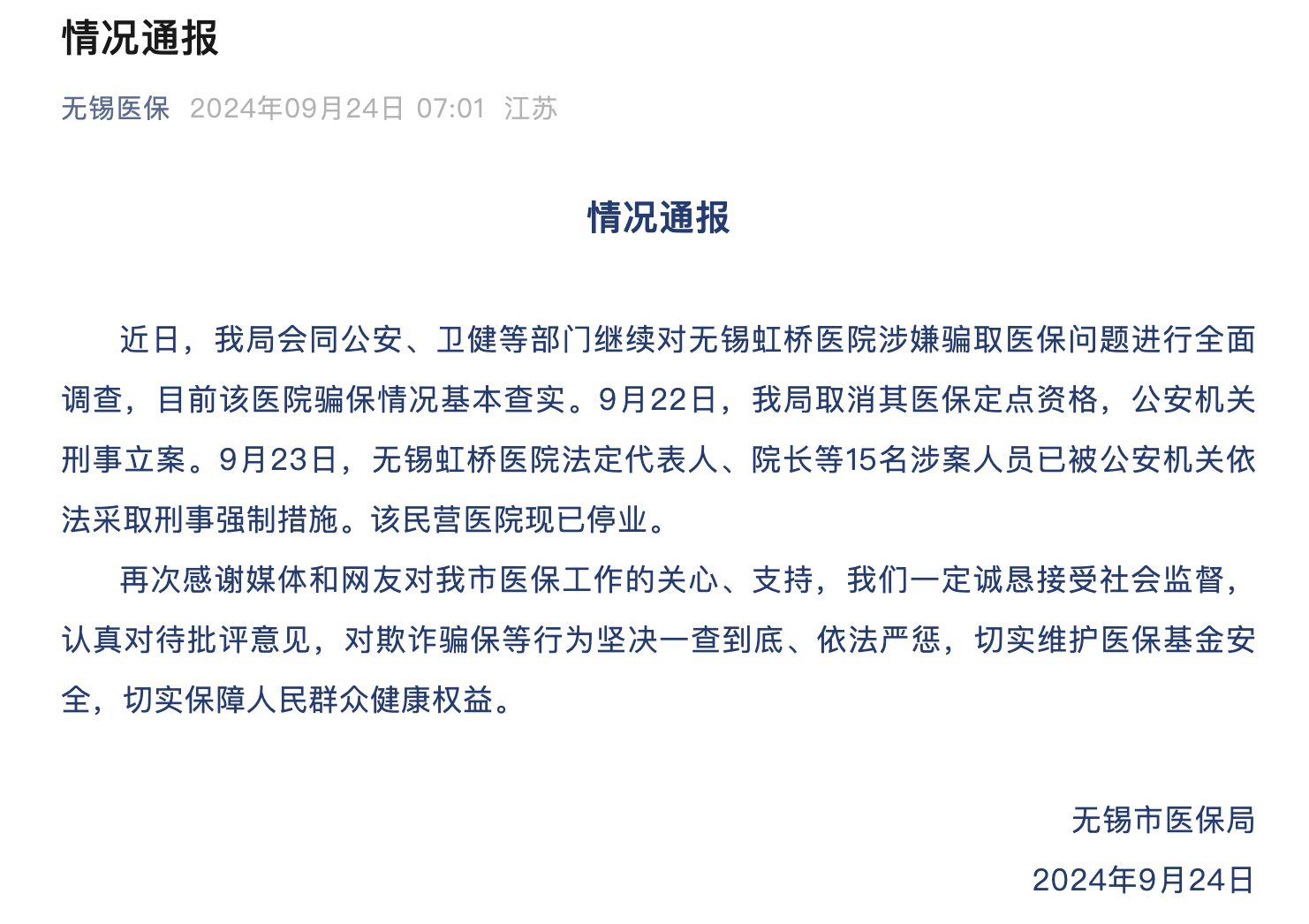 证券时报网讯,无锡市医保局今天发布情况通报称,近日,该局会同公安、卫健等部门继续对无锡虹桥医院涉嫌骗取医保问题进行全面调查,目前该医院骗保情况基本查实。9月22日,该局取消其医保定点资格,公安机关刑事立案。9月23日,无锡虹桥医院法定代表人、院长等15名涉案人员已被公安机关依法采取刑事强制措施。该民营医院现已停业。