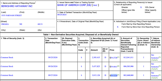 值得注意的是,伯克希尔哈撒韦当地时间9月27日向美国证券交易委员会提交的文件显示,该公司于9月25日至27日共售出11678366股美国银行普通股,总价值约4.6亿美元。
