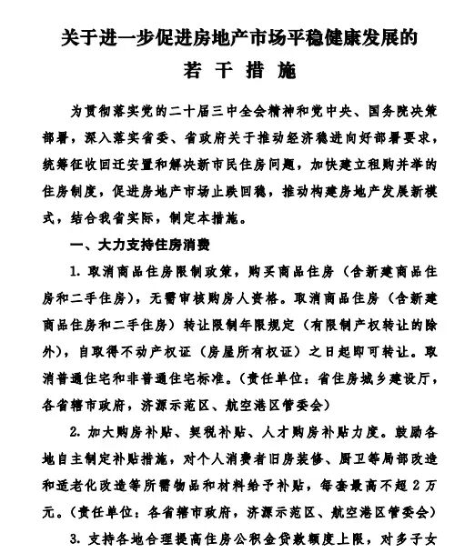 9月30日,河南省住房和城乡建设厅、中共河南省委金融委员会办公室等7部门联合印发《关于进一步促进房地产市场平稳健康发展的若干措施》(下称《措施》),从大力支持住房消费、加大金融支持力度、严格控制增量供应、进一步优化存量、提高供应质量、推动构建房地产发展新模式六大方面提振市场。