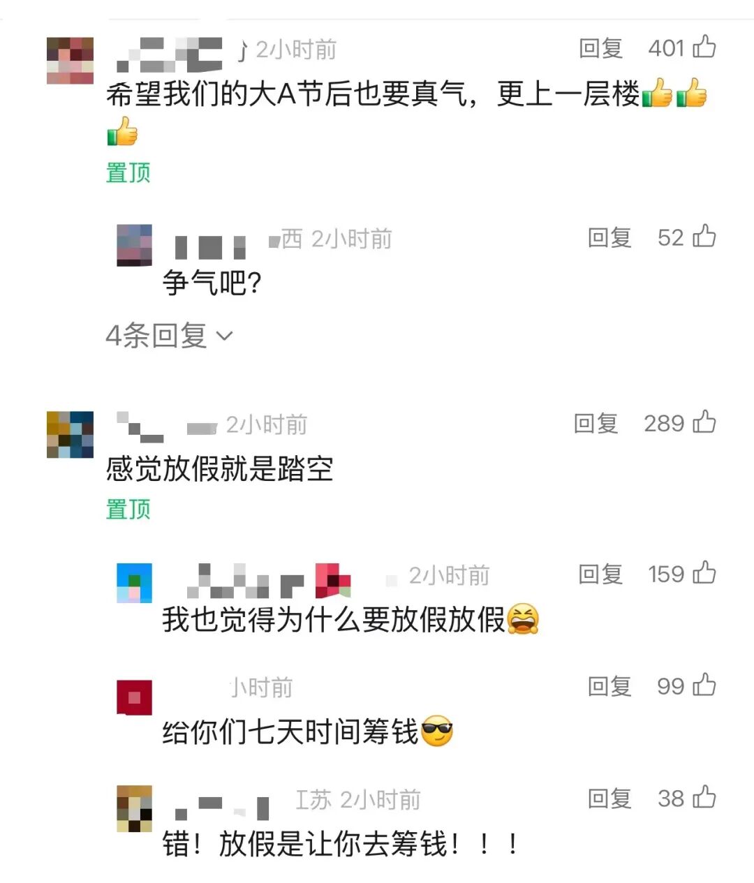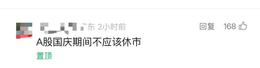 A股股民不淡定了。有网友留言:“A股国庆期间不应该休市”、“感觉放假就是踏空”、“头一次觉得假期太长了”、“抓紧开盘吧别过节了”。
