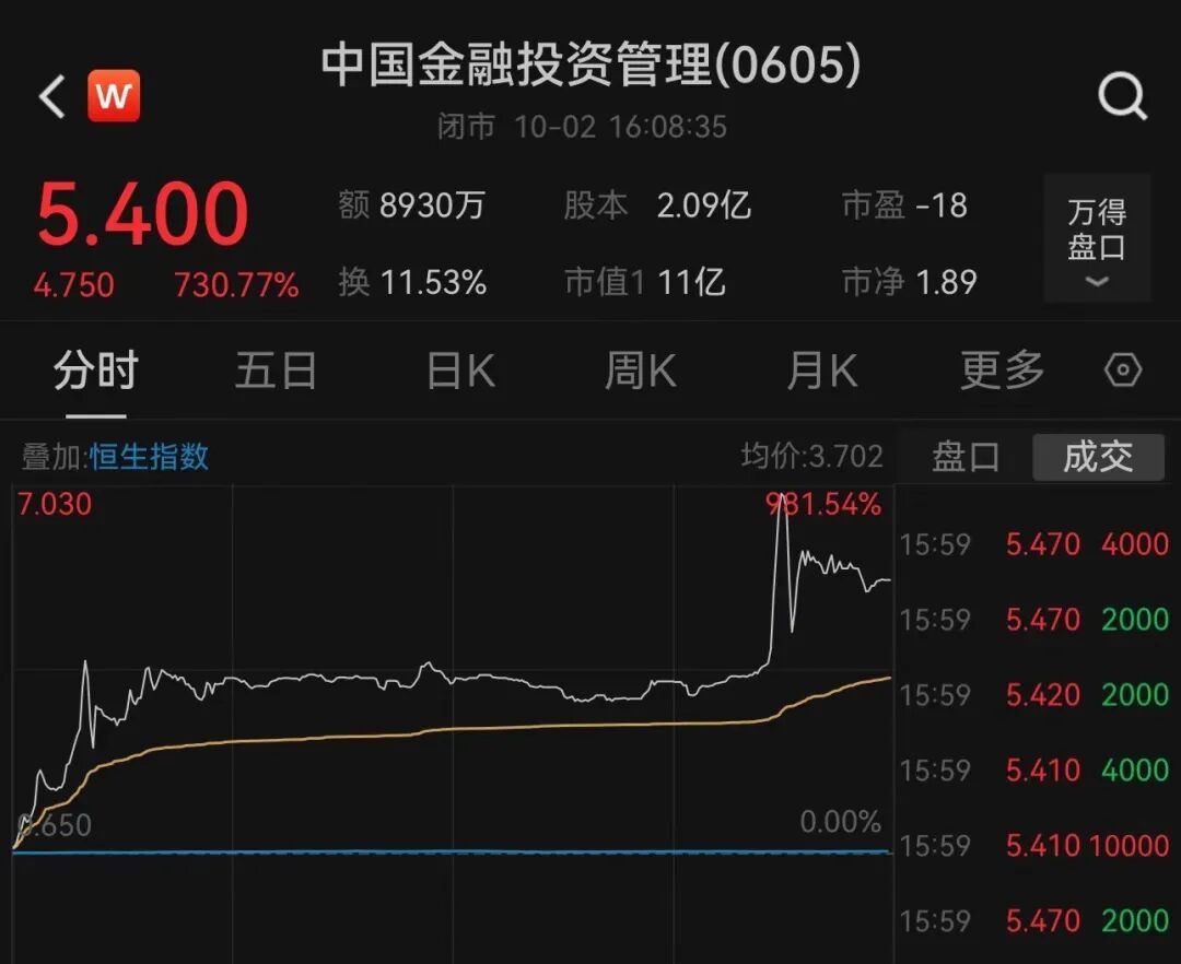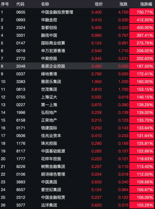 共有26只港股单日涨超100%。其中,中国金融投资管理涨超730%,盘中一度涨近10倍。
