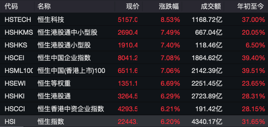 港股全天沸腾,截至收盘,香港恒生指数收涨6.2%,恒生科技指数涨8.53%。