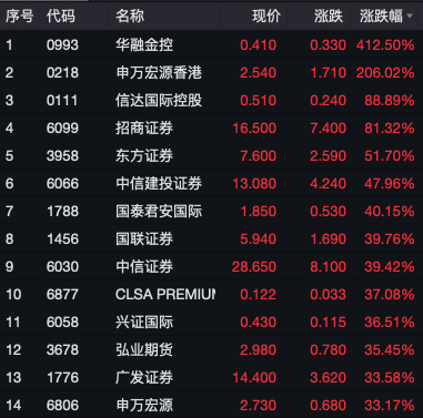 内资券商股持续飙升。华融金控、申万宏源香港分别收涨412.5%、206.02%。招商证券涨超81%,中信证券涨超39%,申万宏源涨超33%。
