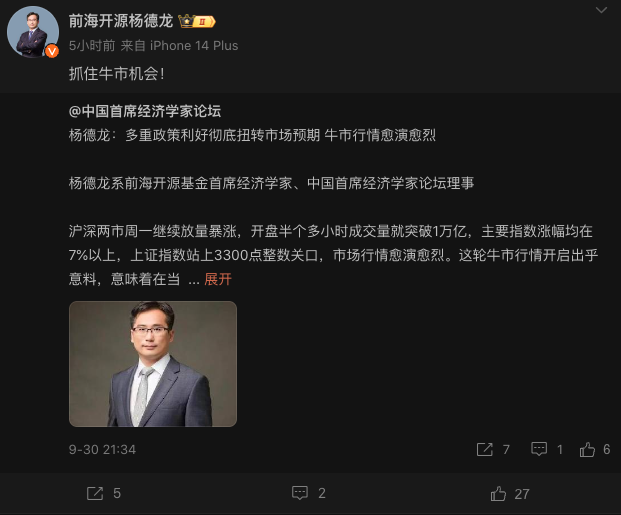 前海开源杨德龙在微博评论其此前的观点称,抓住牛市机会。