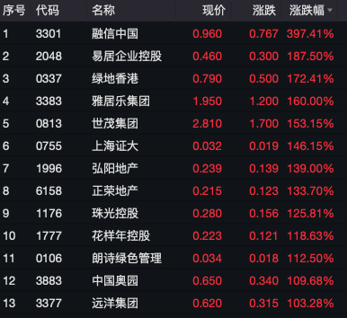 板块方面,内房股尾盘还继续拉升,13只个股收涨超100%。其中,融信中国最终涨超397%,绿地香港涨超172%,雅居乐集团涨超160%,世茂集团涨超153%。