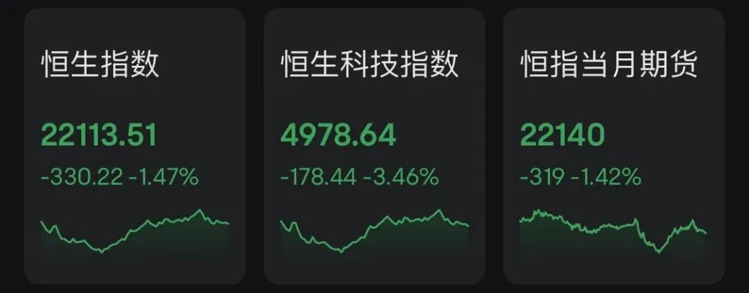 但盘中多次V形反转,午后部分中资股表现强势,一度带动恒生指数跌幅逐级收窄。恒生指数全日跌330点或1.47%,报22113点;国企指数跌127点或1.58%,报7914点;恒生科技指数跌178点或3.46%,报4978点。主板成交3103亿港元。