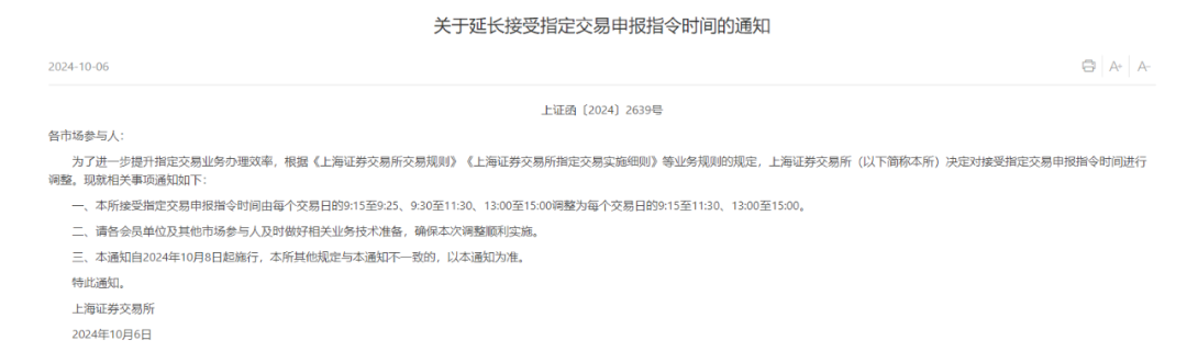 上交所接受指定交易申报指令时间由每个交易日的9:15至9:25、9:30至11:30、13:00至15:00调整为每个交易日的9:15至11:30、13:00至15:00。该通知自2024年10月8日起施行。