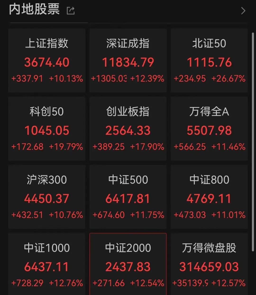 A股三大指数集体高开,沪指涨10.13%,深证成指涨12.67%,创业板指涨18.44%。盘面上,各板块普涨,医疗保健、半导体、软件服务、电表仪器等板块涨幅居前。截至发稿有所回落。