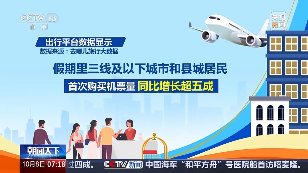 这个假期,出行更加便利,不少城市新建机场、新增航线,为游客提供更多选择。出行平台数据显示,假期里三线及以下城市和县城居民首次购买机票量同比增长超五成,出境游订单量同比增长近3倍。