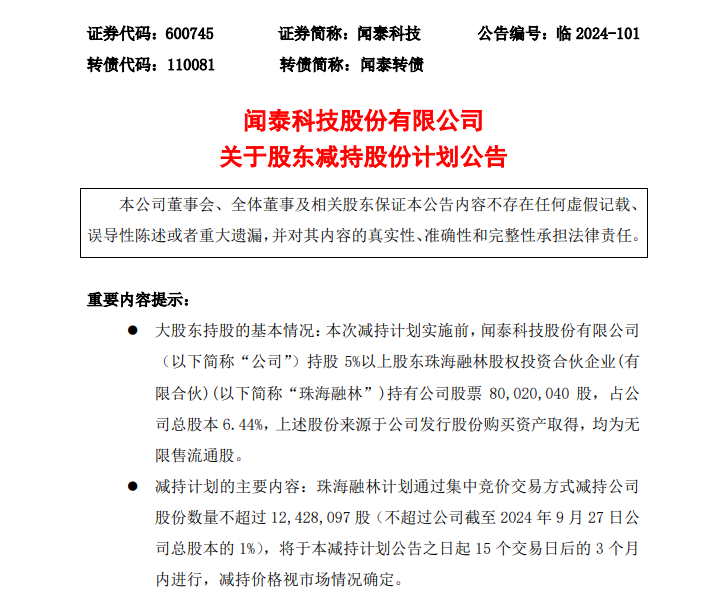 在此之前,闻泰科技在今年9月30日晚间曾披露一份股东减持计划,该计划显示,公司持股5%以上的股东珠海融林股权投资合伙企业(有限合伙)(以下简称“珠海融林”)计划通过集中竞价交易方式减持公司股份数量不超过1242.81万股,不超过公司截至2024年9月27日总股本的1%。