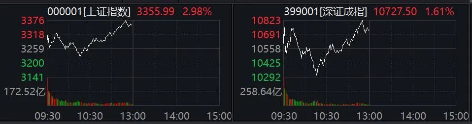 今日早盘,A股探底回升,大盘蓝筹股再度集体走强,上证50一度劲升超4%,领涨市场,上证指数、沪深300等盘中均涨超3%,“中字头”股票大涨,小盘成长股略有调整,科创50指数微幅飘绿。两市成交进一步萎缩,破万亿步伐再度放缓,用时近1小时才突破1万亿元。