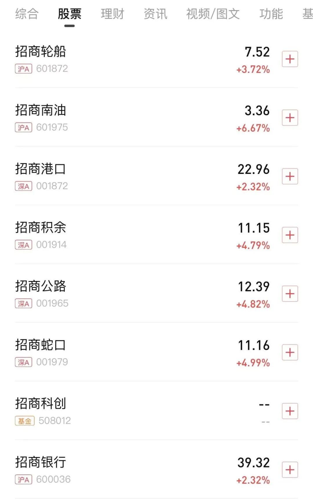 10月14日上午,上述招商系公司出现普涨,招商蛇口、招商南油、招商积余、中国外运等盘内涨幅均大涨超过6%,招商轮船、招商公路盘内涨幅也超过4%。截至发稿时,招商南油、中国外运保持涨超6%,其余涨幅略收窄。
