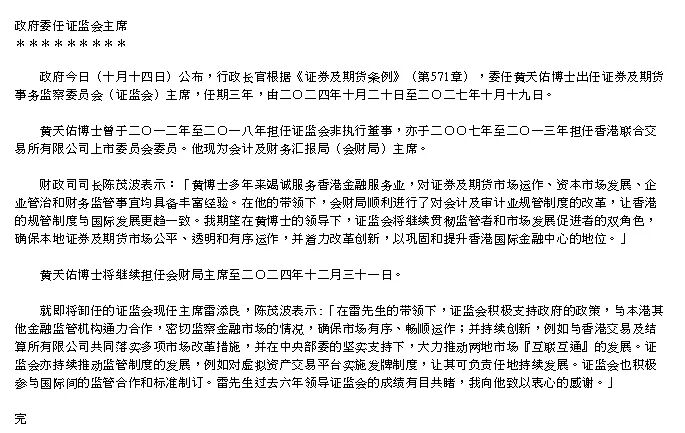 香港特区政府10月14日公布,香港特区行政长官根据《证券及期货条例》(第571章),委任黄天佑博士出任香港证券及期货事务监察委员会主席,任期三年,由2024年10月20日至2027年10月19日。