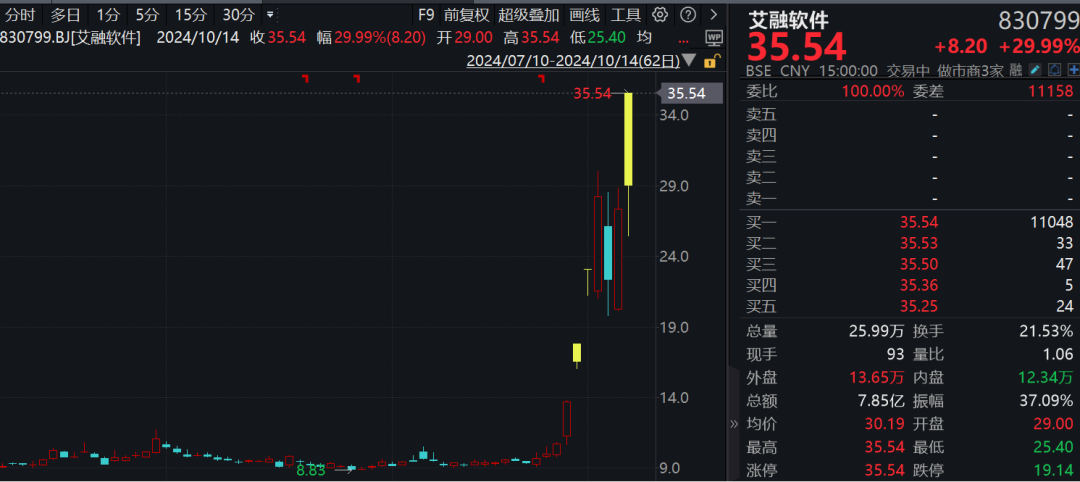 热点方面,华为概念股全线大涨,华为鸿蒙方向领涨,板块指数放量大涨6.32%。板块内个股掀起涨停潮,艾融软件30%涨停,股价创历史新高(复权,下同),自9月24日以来累计飙升280%;慧为智能、科蓝软件等超30股涨停或涨超10%,其中国子软件、润和软件等创历史新高。