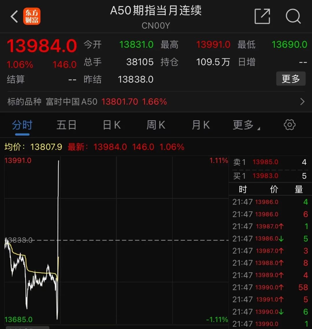 富时中国A50指数期货直线拉升,现涨超1%,此前一度下跌超1%。