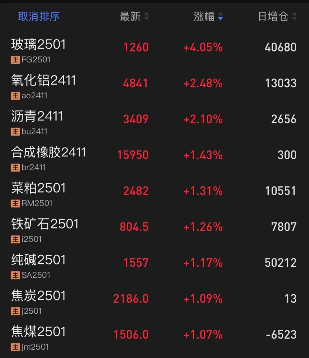 国内夜盘期货市场多数上涨。截至发稿,玻璃涨超4%,氧化铝、沥青涨超2%。