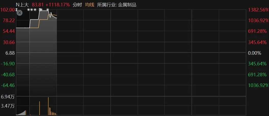 今日上市的新股N上大(301522)涨幅一度扩大至1346%,触发二次临停,截至发稿,该股成交超20亿元。该股今早直接高开800%触及涨幅限制。