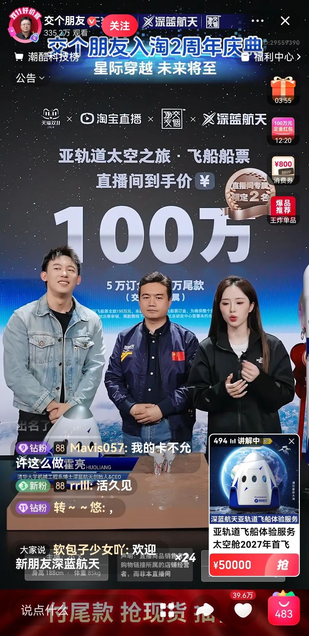 在直播间,霍亮直接给予下单减免50万元的优惠,到手票价只需100万元/张,预售的两张船票秒售罄。