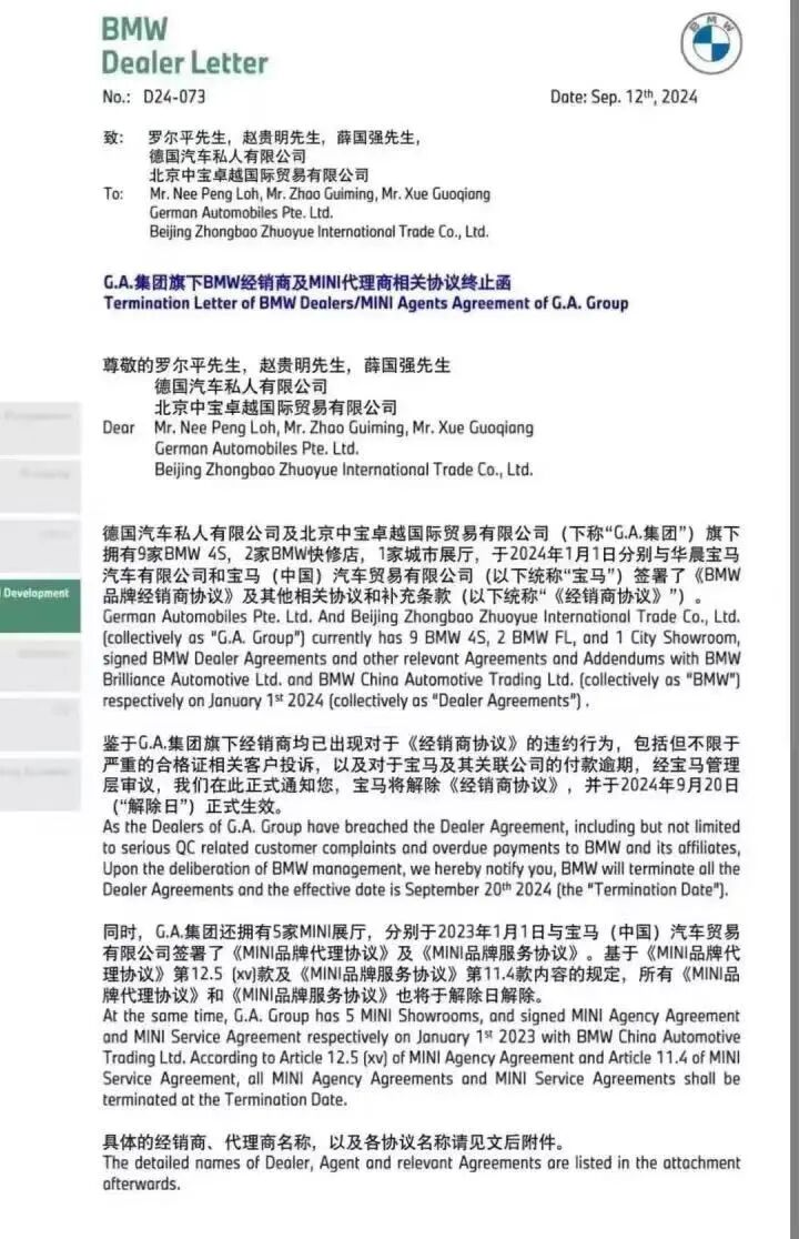 北京星德宝隶属于新加坡G.A.集团,该集团是宝马在中国最早的五大代理商之一,旗下还拥有多个豪华品牌的销售代理权。然而,由于市场竞争的加剧以及新兴品牌的崛起,G.A.集团的经营状况逐渐恶化,且对宝马及其关联公司的付款出现逾期。最终,宝马宣布与G.A.集团解约,并终止了对北京星德宝的授权。