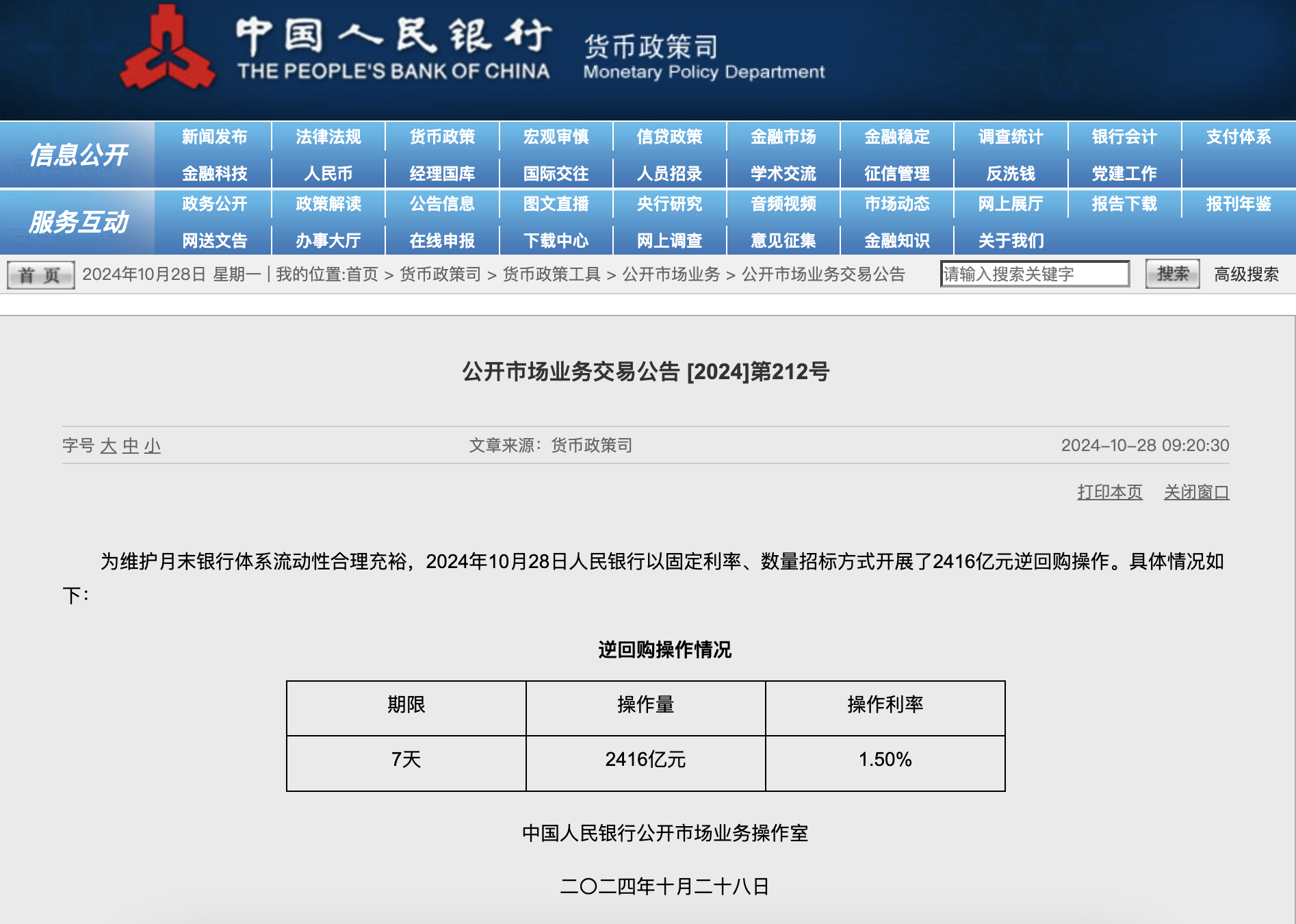 证券时报网讯,据央行网站消息,为维护月末银行体系流动性合理充裕,2024年10月28日人民银行以固定利率、数量招标方式开展了2416亿元7天期逆回购操作。操作利率为1.5%,与此前持平。