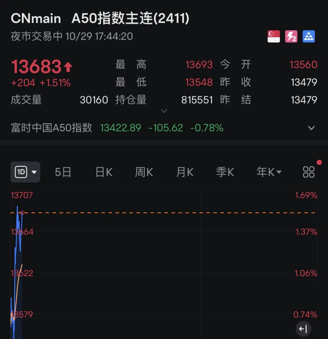 开盘后,A50指数直线拉升,涨超1.5%。此外,美股热门中概股盘中也集体拉升,蔚来涨超6%,阿里巴巴、拼多多涨幅超3%。