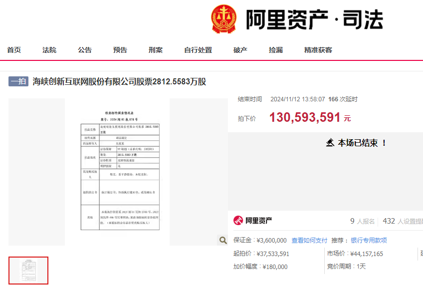 拍卖平台显示,因股权转让协议纠纷,吴艳所持的2812.56万股ST峡创股份,被福建省福州市中级人民法院强制司法拍卖。起拍价为3753.36万元,折合1.33元/股。而此次拍卖前一交易日,即11月8日,ST峡创收盘于3.04元/股。