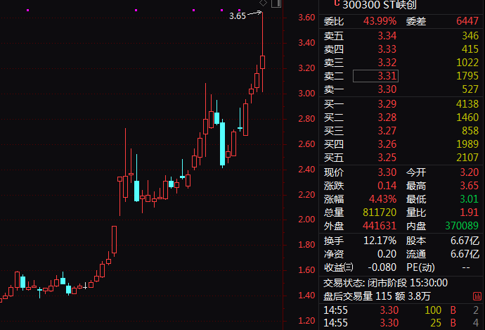 不过,受今日大盘下午的回调,ST峡创在竞拍结束后,股价也出现回调,最终收盘于3.3元/股,涨幅4.43%。若据此估算,此次法拍的成交价,较二级市场股价溢价高达40.6%。