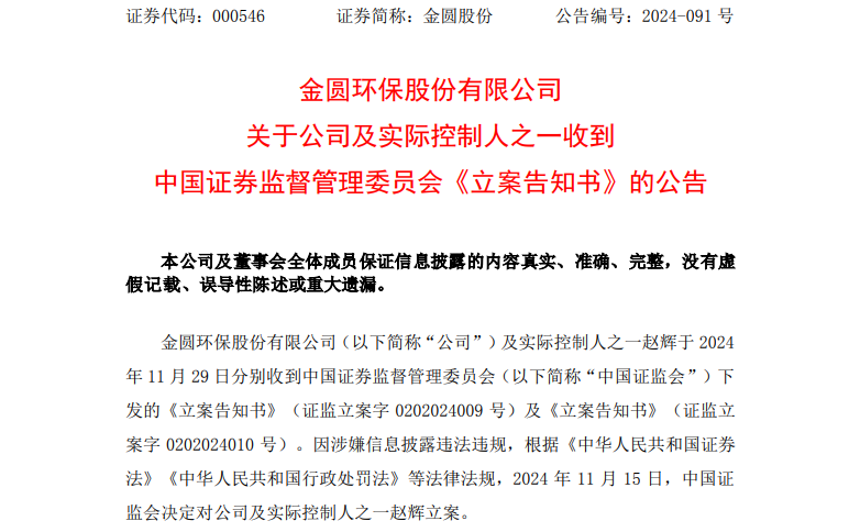 金圆股份(000546)11月29日晚间公告,公司及实控人之一赵辉分别收到证监会下发的立案告知书。