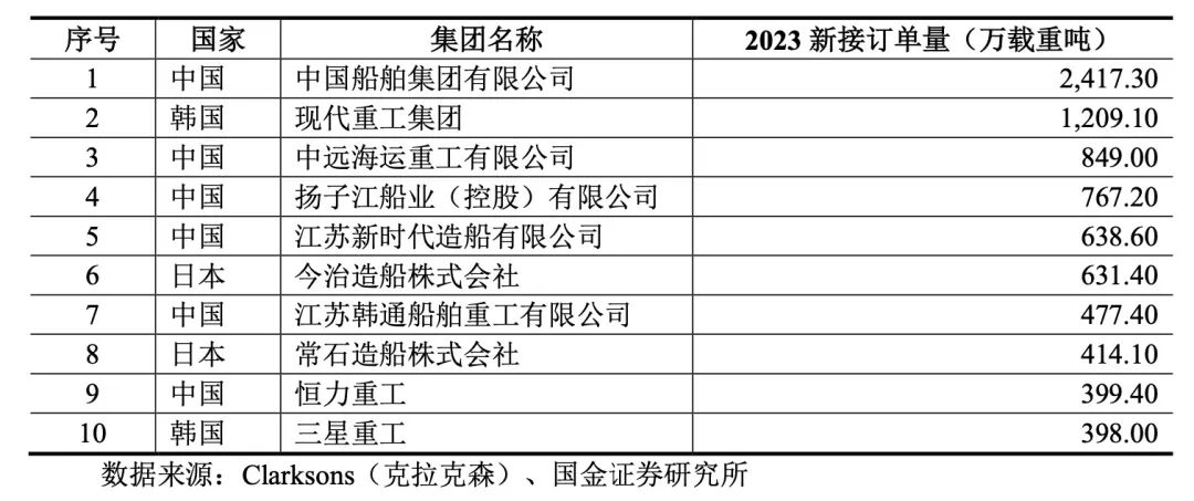 根据Clarksons(克拉克森)和国金证券研究所数据,2023年恒力重工新接订单399.40万载重吨,位居中国第六,力压三星重工位居全球第九。目前,恒力重工喷涂车间、涂装车间、钢加厂房、区组厂房及平组厂房配置完备,水平船台及大型干船坞均配备多台大型龙门起重机,可同步建造多艘30万载重吨级以上整船,恒力重工具备船用发动机自主生产能力。