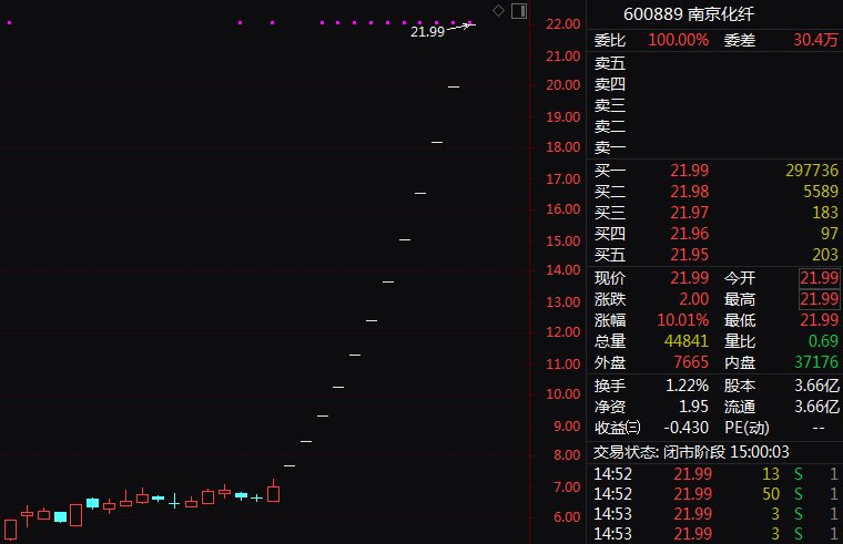 11月18日,南京化纤迎来复牌,当天开盘一字涨停,换手率仅0.2%,超8亿资金在涨停板抢筹。此后,南京化纤股价一路涨停。12月3日,南京化纤再度涨停,报21.99元/股,换手率1.22%,总市值80.56亿元。