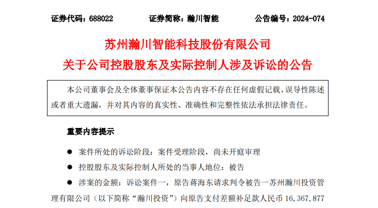 瀚川智能(688022)身处多事之秋,如今控股股东和实际控制人成了被告,原告则是去年参与定增的“牛散”蒋海东。