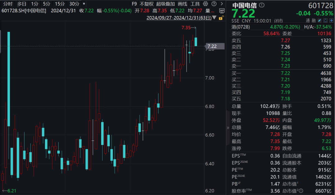 市场热点方面,蓝筹股相对抗跌,电信运营板块中,中国移动、中国电信均在2024年最后一个交易日创出历史新高(复权,下同)。港股中国移动则创出近3个月来新高,中国电信亦在历史高位附近徘徊。