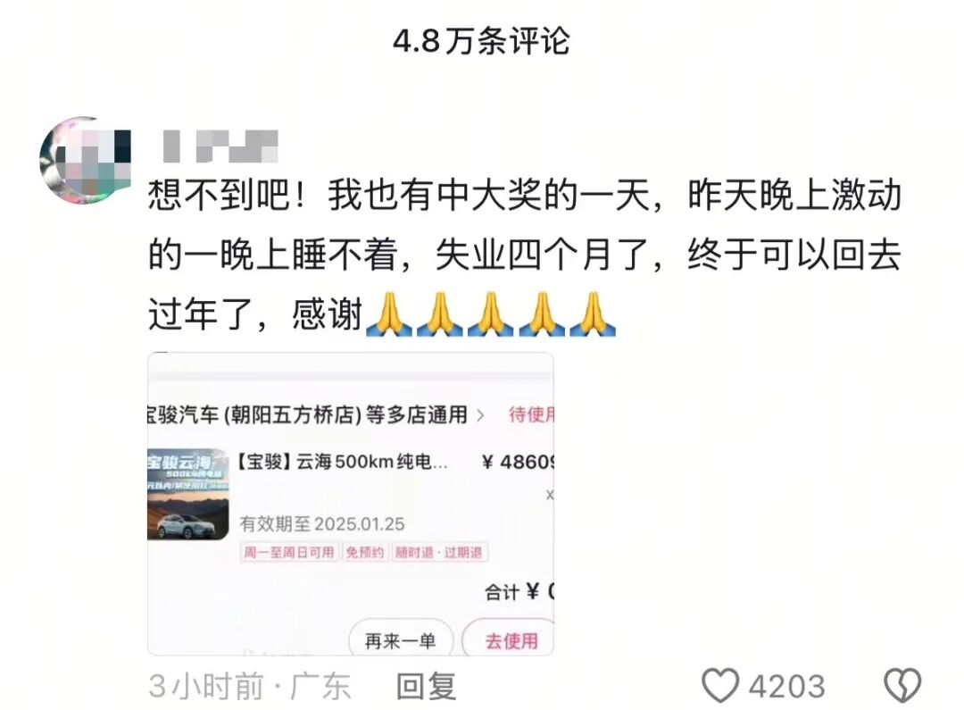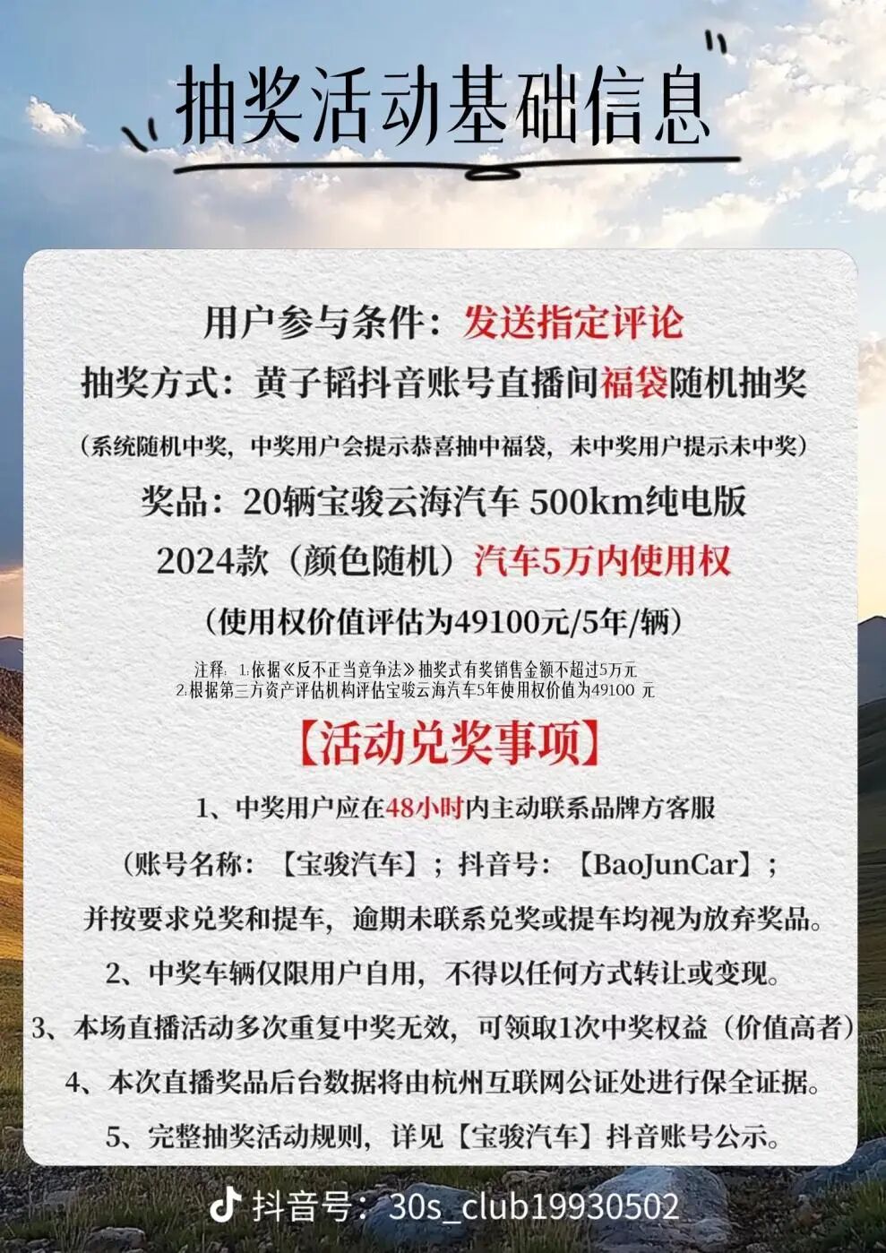 黄子韬社交平台账号的发布的信息显示,本次送出的了车为宝骏云海,纯电500km续航款。该车型官方售价在123800元/辆,因为直播抽奖属于有奖销售内容,要求不能超过5万元,所以最终只能送出汽车使用权。