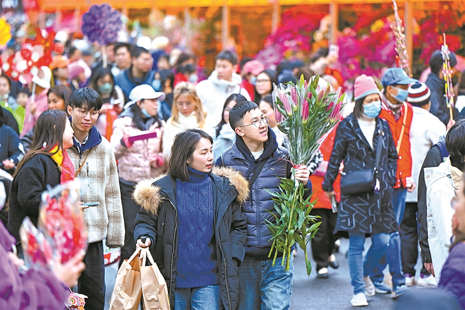 1月26日,广东广州海珠迎春花市开市,市民购买花卉。逛迎春花市为广府地区春节前的一项传统民俗,俗称“行花街”,是国家级非物质文化遗产代表性项目之一。 中新社记者 陈骥旻/摄