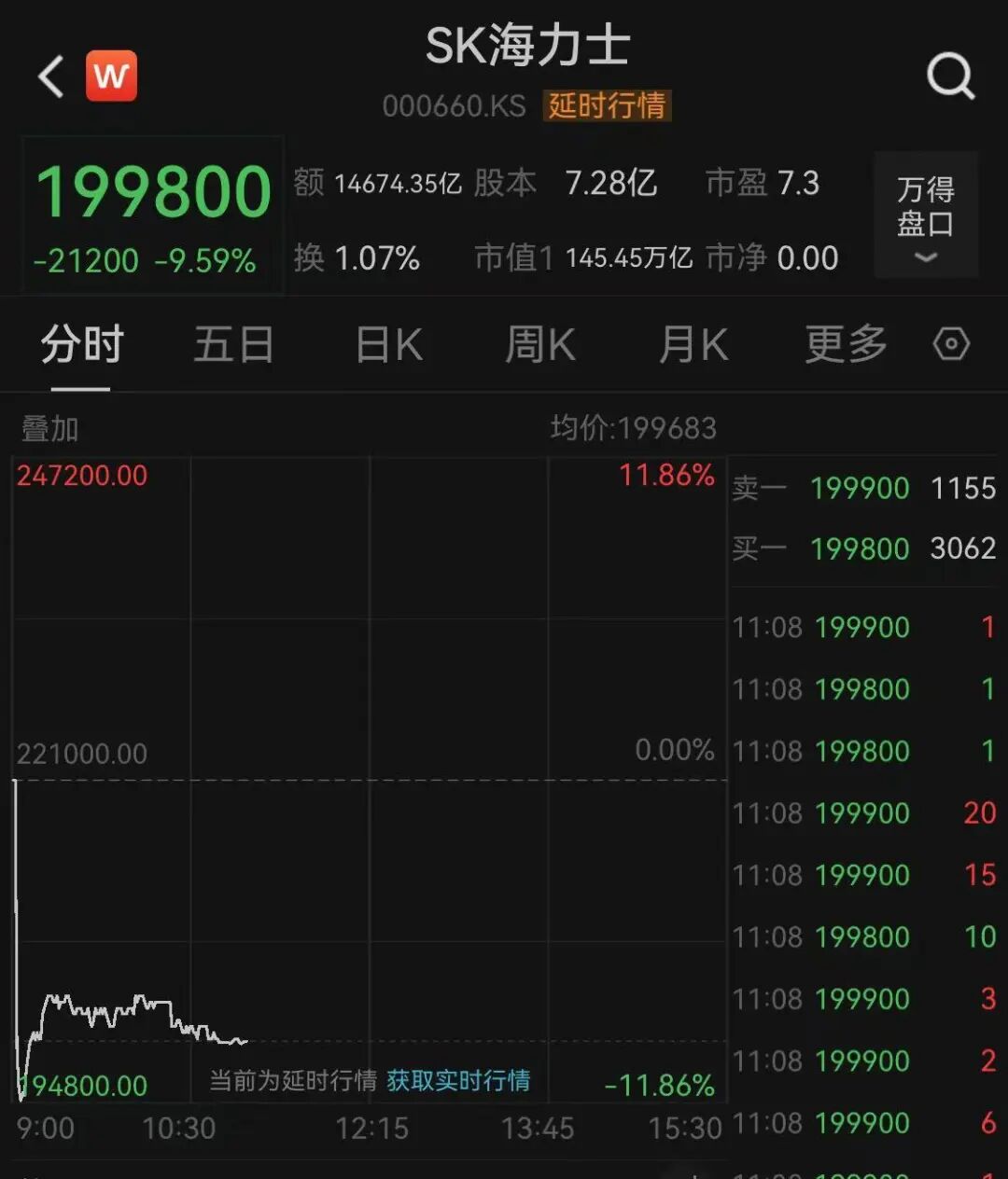 其中,全球第二大内存芯片制造商韩国SK海力士股价下跌逾11%,截至记者发稿,股价下跌9.59%。