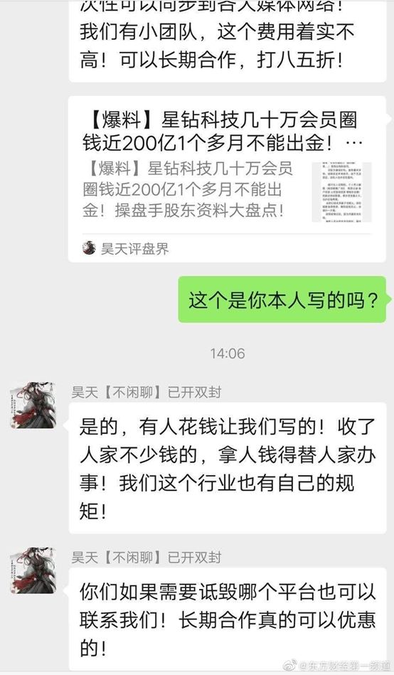 在此暴力高压的情境下,几乎没有投资者敢出头。“只要发一点星钻负面消息就被骂或被围攻,大家都是会员钱不到账很急,就不能有一点抱怨?”有投资者表示。