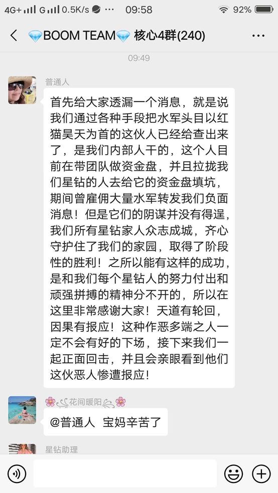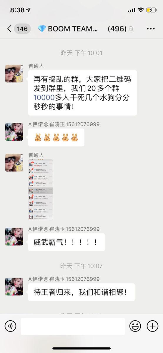 在这些群里,稍有疑问和异议者便会受到维稳人士的围攻,最后被踢出群。维稳团队几乎对所有的星钻群享有把控权。如果不是他们能把控的群,便会号召大量人攻陷,大量、集中、刷屏式的谩骂、洗白文,10分钟之内可以刷到上千条信息。然后他们会举报那个群,让群被封。