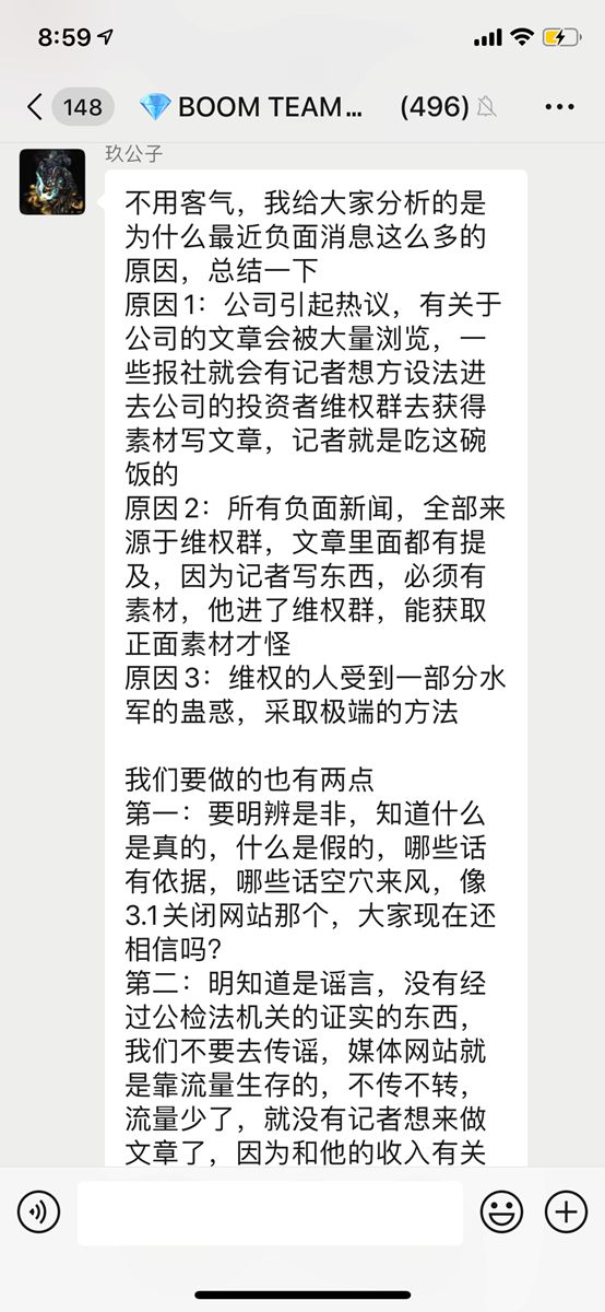 当日晚间,有自称投资者的“玖公子”,在维稳群内做了45分钟语音的“正面解读”,力证平台安全,并逐条反驳本报报道内容。这份解读,被精心剪辑成音频文件,发布在各大群里,群内刷屏赞美玖公子的解读。