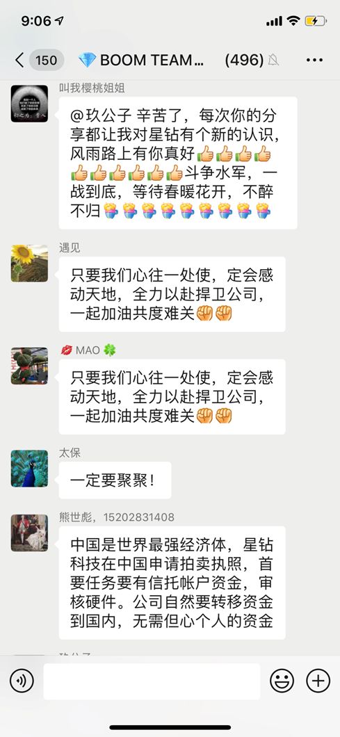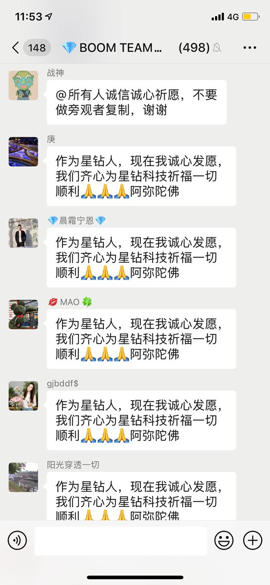 更魔幻的是,他们会在群里发几百条一模一样为星钻祈愿祝福的微信,在纸上写成千上万个“星钻我爱你”,群里说的最多的话就是,信任的力量,相信的力量,相信星钻,信任星钻。