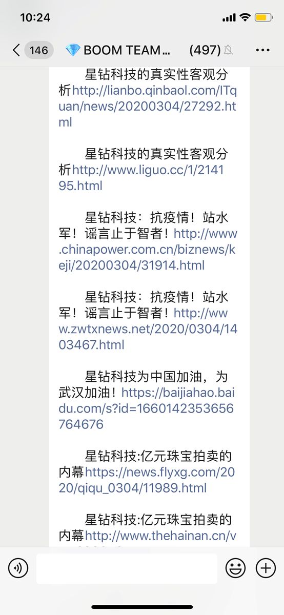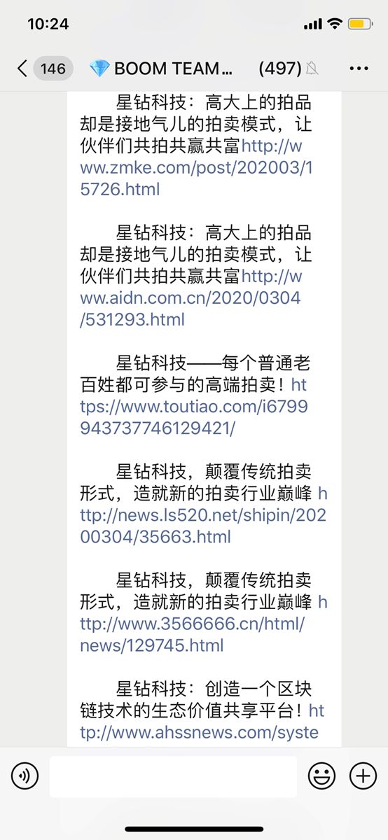 与此同时,有关星钻拍卖的“正面报道”全面展开,几十篇文章链接发布在群里,让大家去各个平台发帖、顶帖、评论。这些文章内容雷同,有的是推广软文,有的类似“水军”自由发帖,还有的由个人在自媒体平台上注册看似高大上的账号发布。现在搜索星钻拍卖的信息,引擎上出来的全是此类“洗白文”,媒体的正规报道则沉了下去。