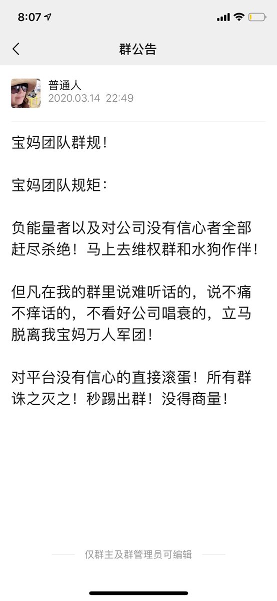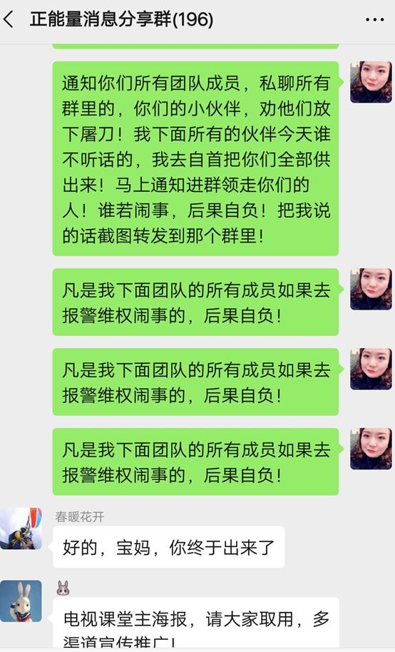一位北京地区的投资者,他在群里呼吁大家一起报警,也收集了一些投资者的资料,准备一起递交经侦,还没有行动,就被维稳团队各种骚扰。各种人以维权理由加他微信,但通过后,他们开始投诉他的微信账号,因该微信号和公司的财务有关联,给工作带来很多麻烦。此外,维稳团队还给110打电话说他聚众滋事,导致他一天内被两个派出所约谈。还被上线告知,这么折腾钱也回不来,最好耐心等待公司消息,也不会给自己找麻烦。“因为儿子上学的学校,他们也知道,我自己一个人和父母带着孩子,多数时间都是父母接送孩子上学。虽然没有明说,但我认为变相威胁到我的安全了,因为我的所有信息太透明了。”最后,他只好无奈向大家宣告,他不再组织一起报警,请大家自己报警找律师。