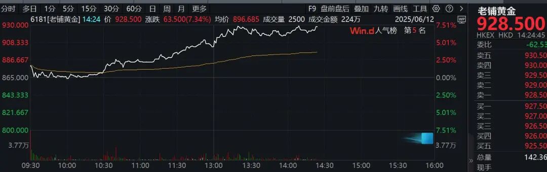 港股老铺黄金午后一度拉升涨超7%,年初至今已升逾290%。