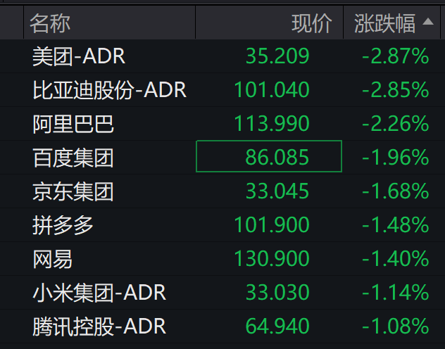 中概科技龙头普跌,美团、比亚迪跌近3%,阿里巴巴跌超2%。