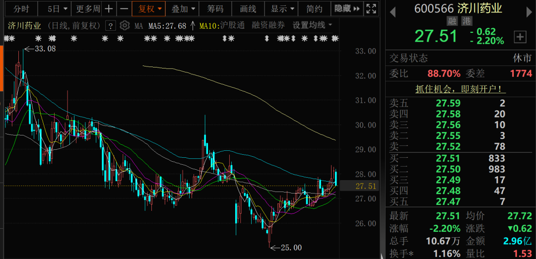 要约价格为26.93元/股,要约收购有效期为30个自然日,自2025年6月18日起至2025年7月17日止。截至6月15日,济川药业的收盘价为27.51元/股,略高于此次要约收购的价格。